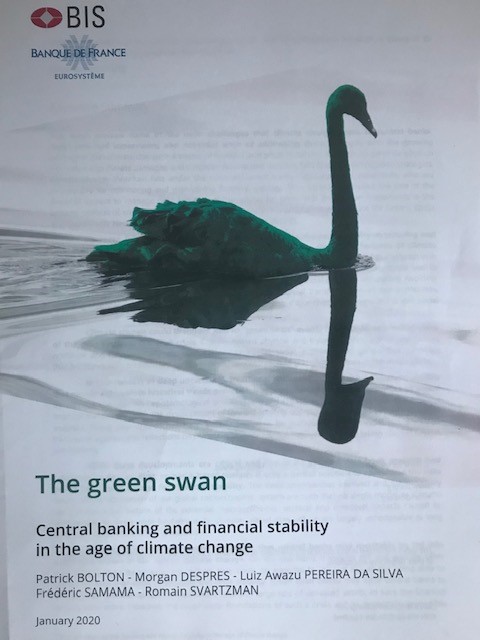 De BIS c.s. vulde die inzichten aan met het concept #greenswan, een Climate Black Swan: A/ events waarvan het hoogst onzeker HOE ze gaan plaatsvinden, B/ waarvan de effecten, zoals klimaatrampen, verstrekkender zijn dan de Black Swans tijdens de kredietcrisis: Green Swans bedreigen – in woorden van de BIS – de wereld zoals we die nu kennen. C/ de effecten bevatten veel kettingreacties, waardoor de uiteindelijke uitwerking op het milieu, de wereldpolitiek en de sociale, economische samenhang enorm en ongekend is.